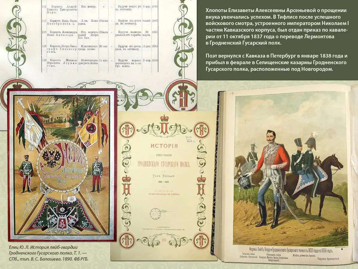В 1890 году была опубликова история Гродненского Гусарского Полка. В который в 1838 году поступил корнет ЛермАнтов. О чем написано в левом верхнем углу картинки. Т. е. все таки при жизни он был именно ЛермАнтов, как и написано в Родословной книге князей.