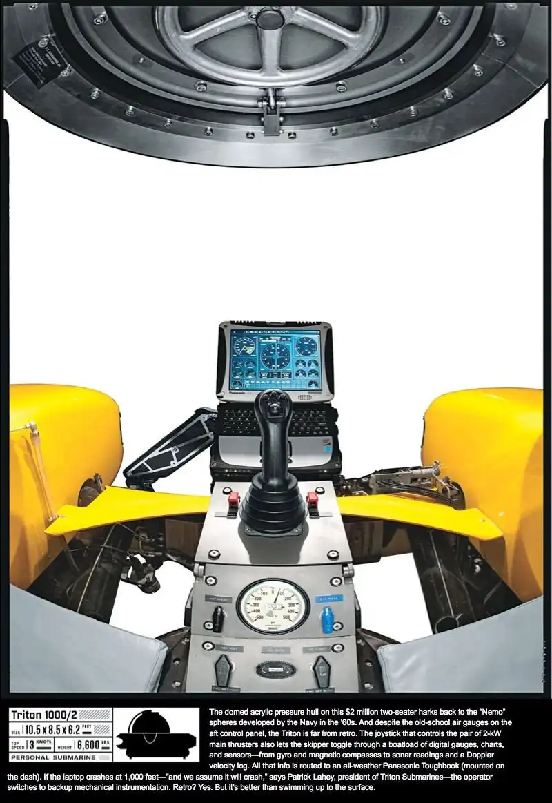 Погружение на максимальную глубину 11 км (36 000 футов) осуществляется примерно за два часа — прекрасный показатель для аппарата, масса которого составляет 9 тонн. Главное достоинство Triton 36000/3 — универсальность. Во-первых, такой лодкой может легко управлять один человек (всего на борт помещается трое), а, во-вторых, ее размер и маневренность делают субмарину идеальным аппаратом как для научных и поисковых подводных экспедиций, так и для элементарного отдыха.