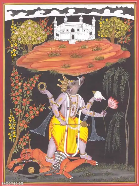 3) Вараха («вепрь»). Согласно легенде, демон Хираньякша подвигами добился того, кто его не мог никто победить. Однако перечисляя возможных врагов, он забыл назвать вепря. Достигнув великой мощи, Хираньякша стал притеснять богов и людей, а землю столкнул в преисподнюю воды. Тогда Вишну воплотился в вепря и убил демона в поединке, длившемся тысячу лет. А затем поднял землю из воды на своих клыках.