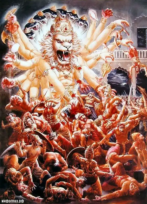 4) Нарасинха («человек-лев»). В этом облике Вишну избавляет землю от тирании демона Хираньякашипу, который добился от Брахмы обещания, что не будет убит ни богом, ни человеком, ни зверем, а также не умрет ни днем, ни ночью, в доме или вне дома. Достигнув неприкосновенности, он заставил своих подданных поклоняться только ему. Однако его сын Прахлада, почитатель Вишну, отказался выполнить это распоряжение. Разгневанный отец приказал убить его. Вишну заступился за Прахладу, и юноше не могли причить вред ни оружие, ни огонь, ни разъяренные животные. Потерявший самообладание Хираньякашипа, на пороге своего дома ударил по колонне. Из разрушенной колонны выскочило невиданное существо — наполовину мужчина, наполовину лев и разтерзало демона на куски.