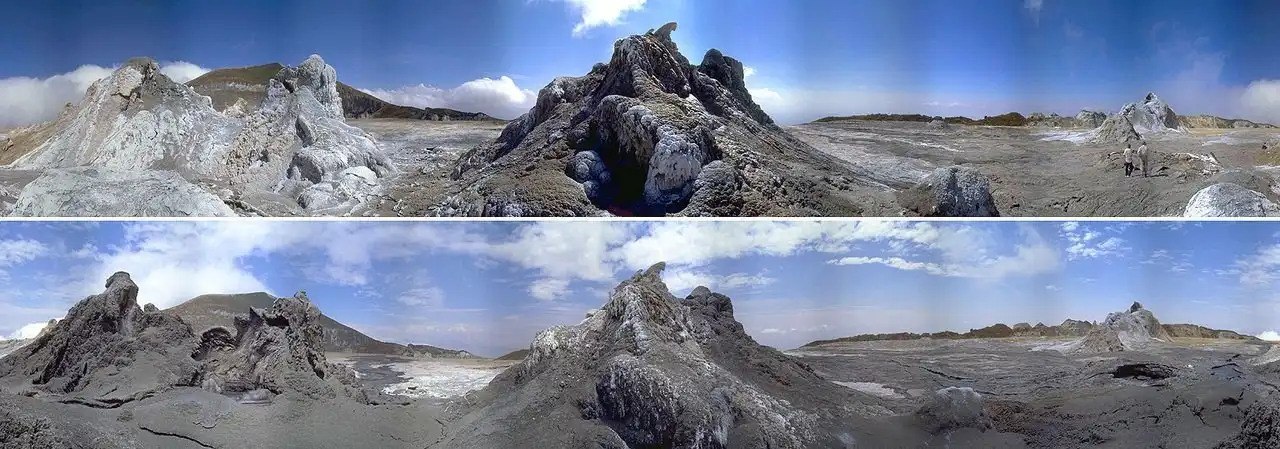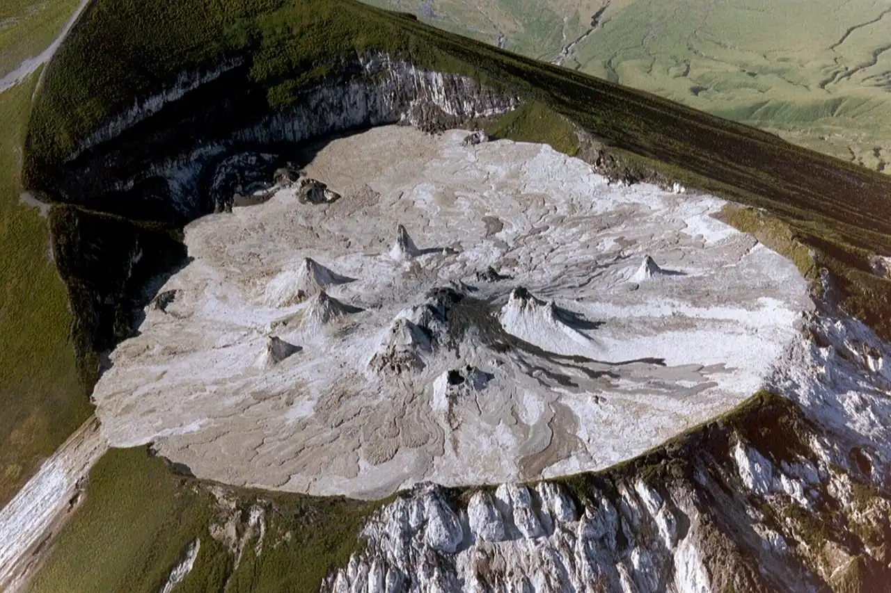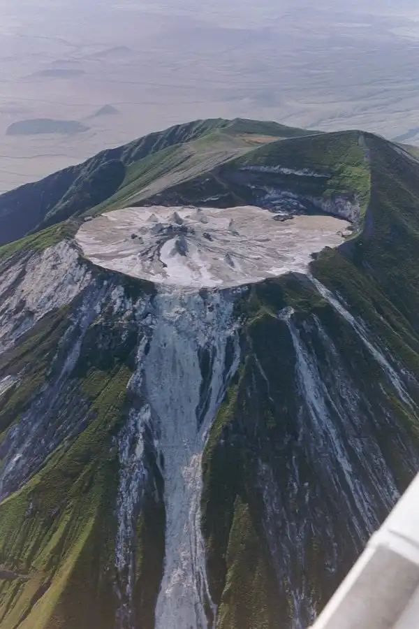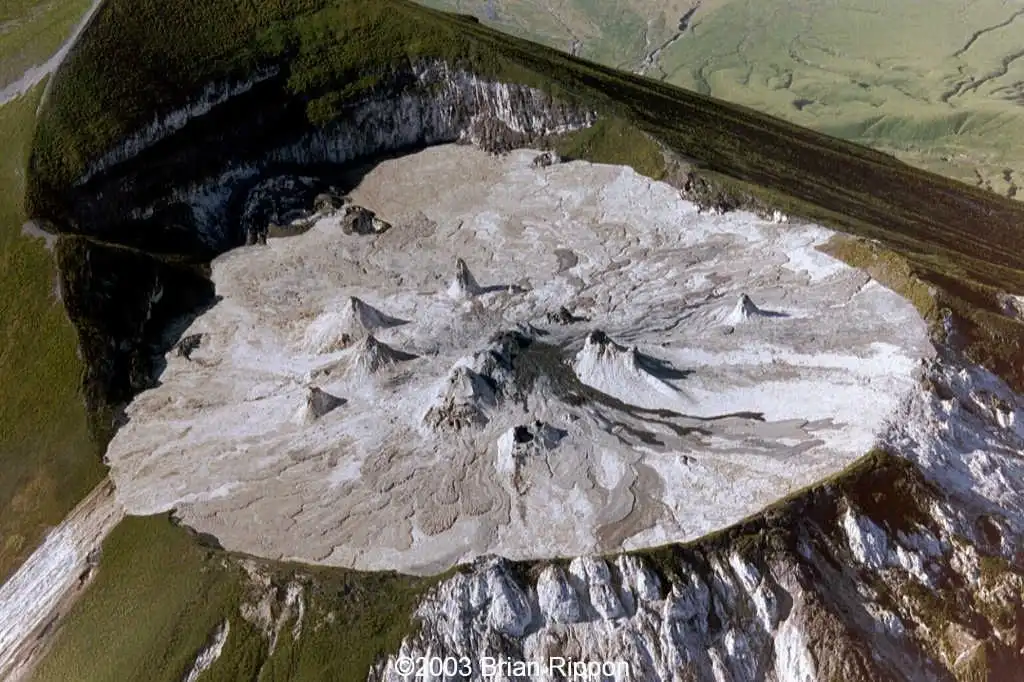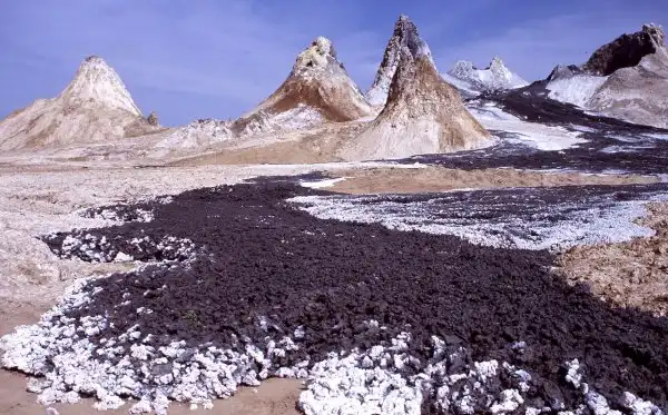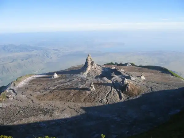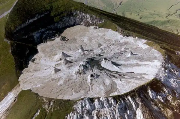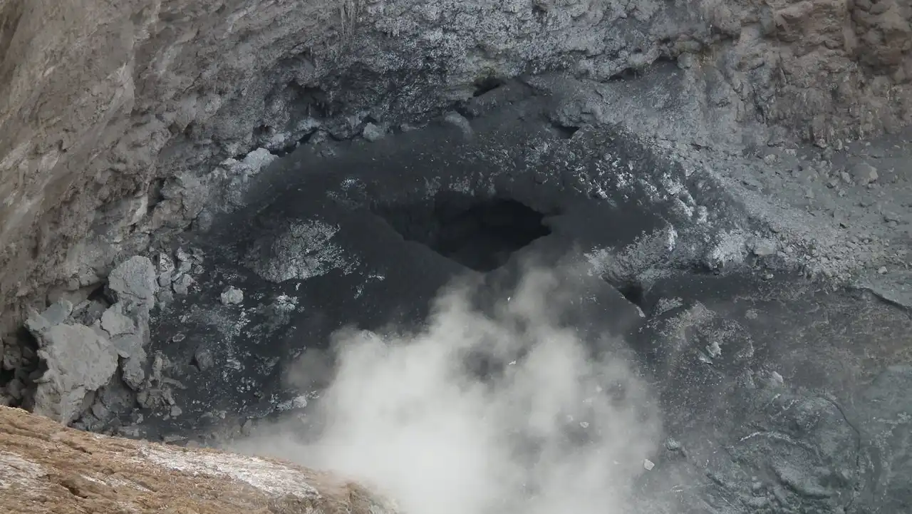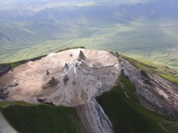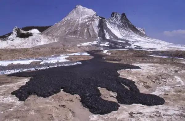 У вершины вулкана находится огромный разлом, земля здесь горячая. Оль Дойньо Ленгаи – гора черного бога. Раньше нужно было спуститься на сто метров ниже, чтобы добраться до дна кратера, но в настоящее время он заполнен до краев застывшими слоями лавы. Необычная лава представляет собою натрокарбонатиды – это вулканические известняки богатые кальцием натрием и углеродом, эта лава течет как вода. Когда эта лава течет она совсем черная, а после дождя, через три часа, она становится белой как снег, а если нет дождя, то достаточно и влаги содержащейся в воздухе, чтобы через три дня она посветлела.