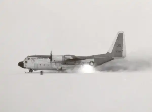 LC-130, 109 AW, использует JATO (взлет с помощью струи ракеты) для взлета на льду. Апрель 2003 года Ледник Гренландии Тодд Valentic