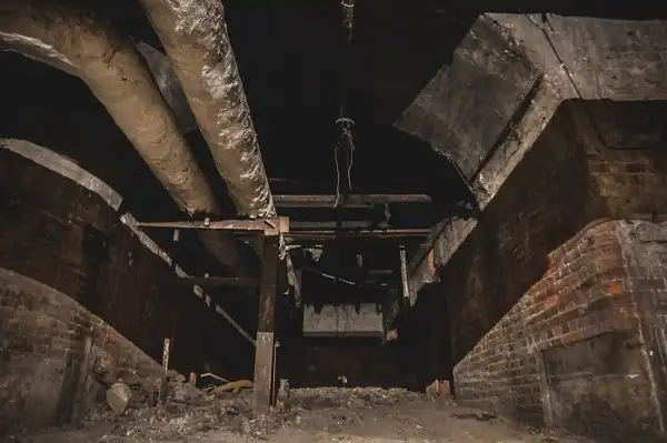 Стены подвала имеют толщину около метра, но во многих местах возведены тонкие кирпичные перегородки, дробящие залы на маленькие каморки и закутки, заваленные многолетним мусором.