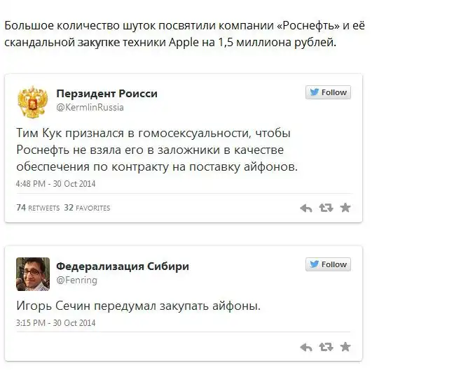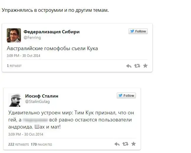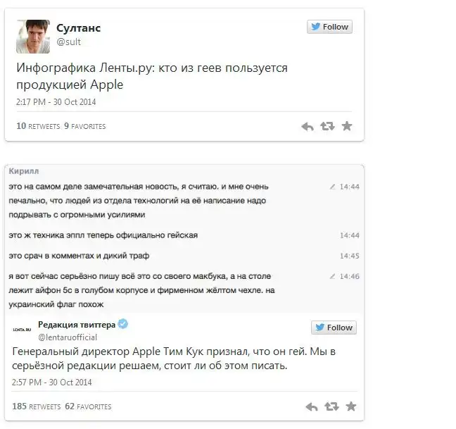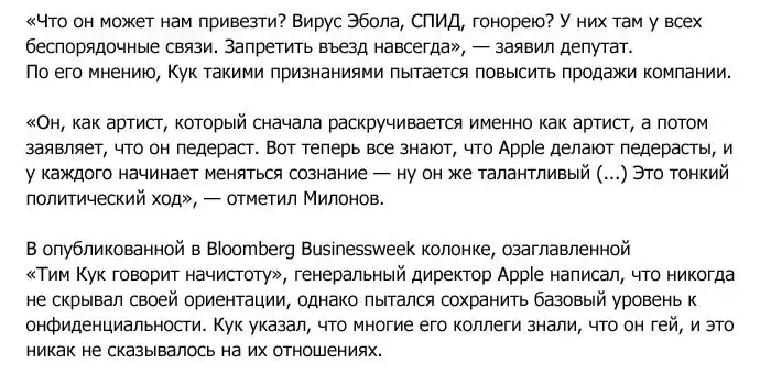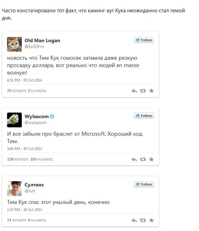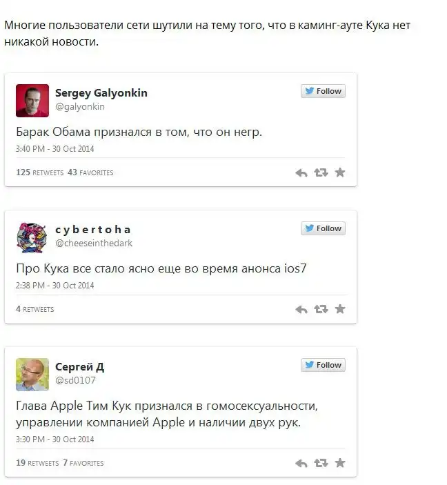 Руководитель компании Apple Тим Кук подтвердил информацию о своей нетрадиционной сексуальной ориентации. Соответствующая статья была напечатана в деловом журнале Business Week. Новость взбудоражила Рунет, как будто раньше об этом никто не знал. А шутка про "гейфон" перестала быть смешной примерно через 15 минут после этого.