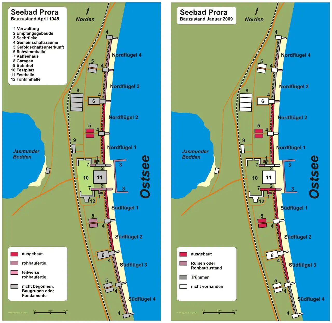 На строительство отеля, в котором приняли участие 9 тысяч рабочих, ушло три года. У нацистов были планы построить еще четыре подобных отеля с кинотеатрами, концертными залами, бассейнами и пристанью, где могли бы пришвартовываться круизные лайнеры.