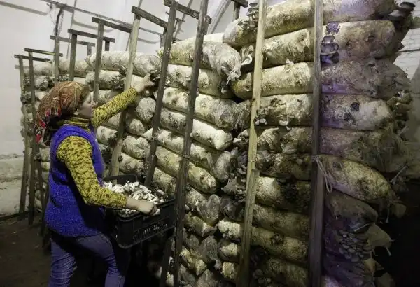 Рабочие сортируют грибы на частной ферме в деревне Минойты.