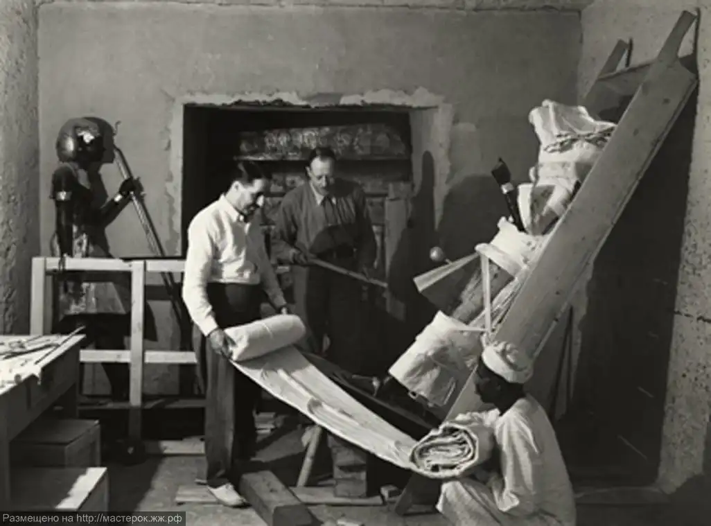 "В этот момент у нас пропало всякое желание вскрывать эти печати, ибо мы вдруг почувствовали, что вторгаемся в запретные владения; это гнетущее чувство еще более усиливали льняные покровы, ниспадавшие с внутреннего ковчега. Нам казалось, что перед нами возник призрак усопшего фараона, и мы должны склониться перед ним ".