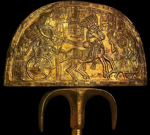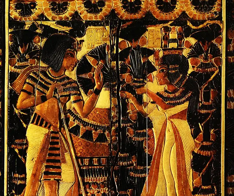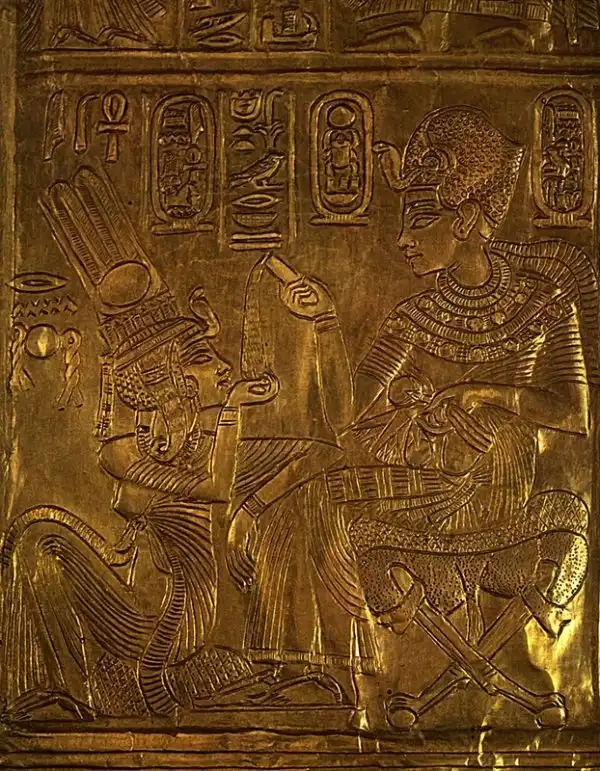 Изобилие колесниц и изображений мчащегося на колеснице мальчика-фараона говорит не столько о божественном его происхождении, которое утвердилось для фараонов с времен Древнего царства (2880—2110 годы до н.э.) и строительства пирамид: еще это обстоятельство, весьма реалистично отображенное художниками за 1350 лет до н. э., говорит... о мальчишестве царя, который обожал быструю езду. Инкрустированное драгоценными и полудрагоценными камнями изображение на спинке трона, где Тутанхамон и его жена Анхесенпаамон любезничают друг с другом, а она, вероятно, умащивает его благовониями, тоже очень реалистично, даже более того: Тутанхамон качается на троне! Что это, как не проявление мальчишества, молодости, непоседливости? Тем более что доказано: портретное сходство фараона потрясающее! Небрежно вскинутая на спинку трона локтем правая рука, в то время как левая покоится на коленях, оторванные от пола задние ножки трона... Мастера будто напрочь забыли каноны, в коих следовало изображать олицетворение Амона-Ра. Разве только полуповорот корпуса намекает на канон. Однако здесь художник гениально вышел из положения, сделав позу естественной, оперев фигуру мальчика локтем на спинку. Какое ему, мальчишке, дело до царства?.. Сплошная любовная идиллия. А о том, что любовь между дочерью Эхнатона и Тутанхамоном была, свидетельствуют хотя бы те два мертворожденных младенца, о которых говорил сэр Алан Гардинер. Даже если первоначально любви не было, родительское горе должно было сблизить Тутанхамона и Анхесенпаамон.