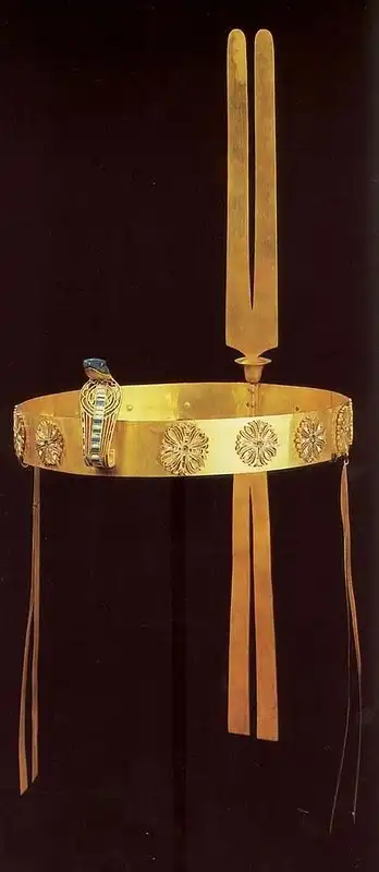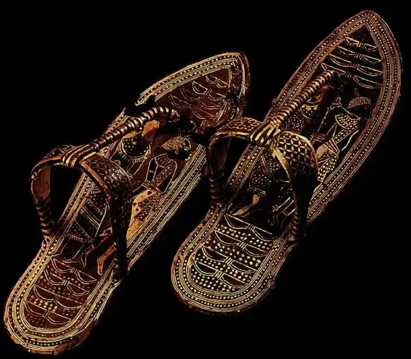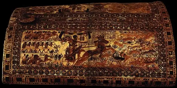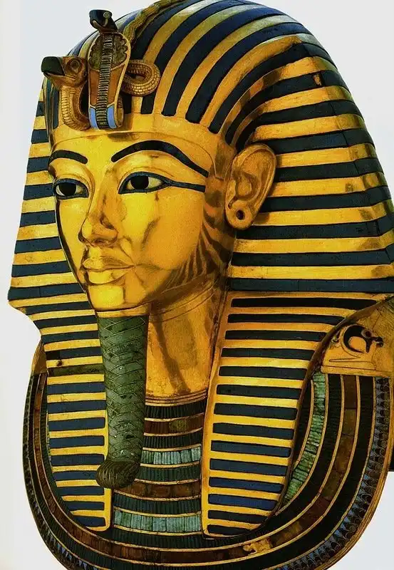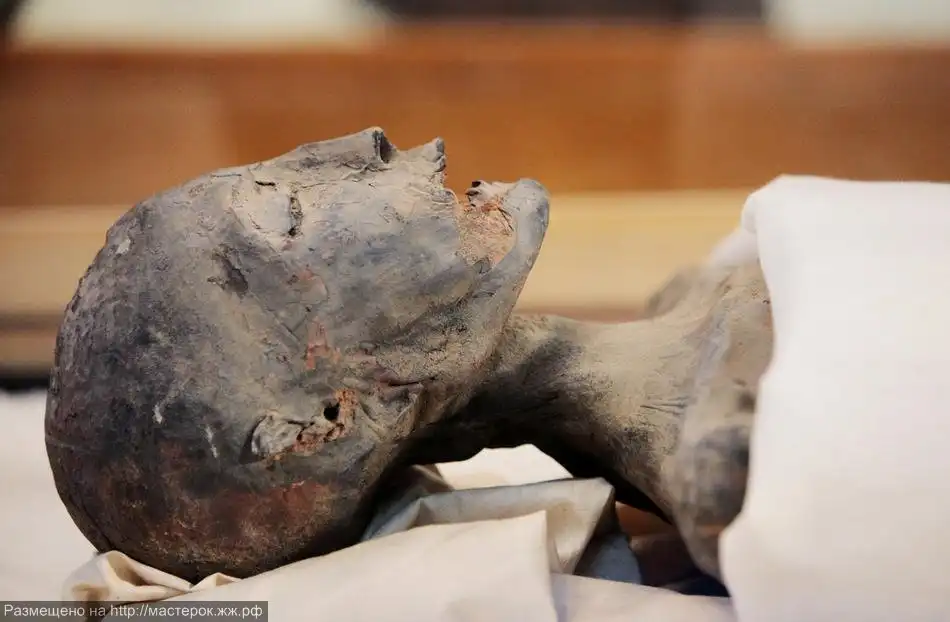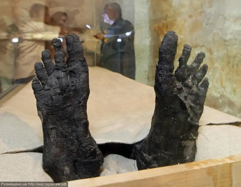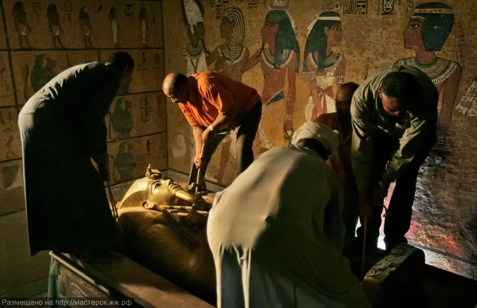 Мумия была залита ароматической смолой, а голову и плечи покрывала золотая маска, лицо фараона было грустным и несколько задумчивым. Выполненные из золотого листа руки были скрещены на груди.