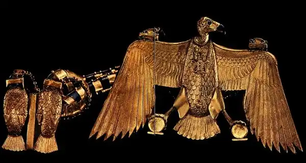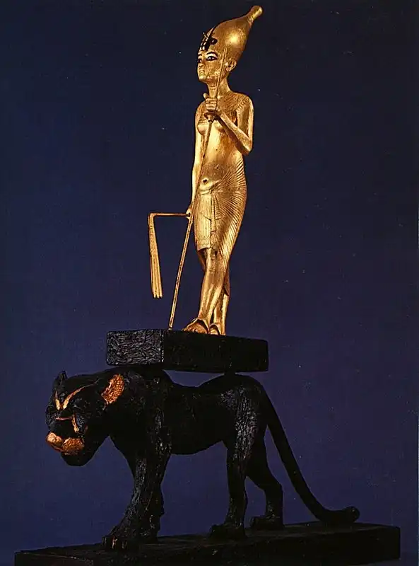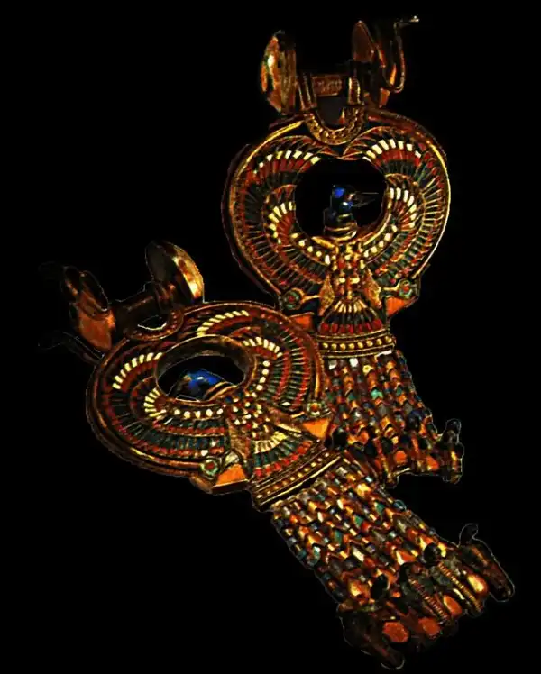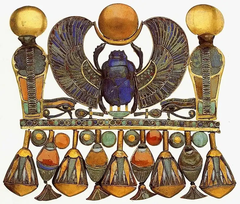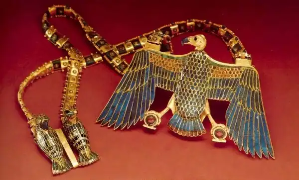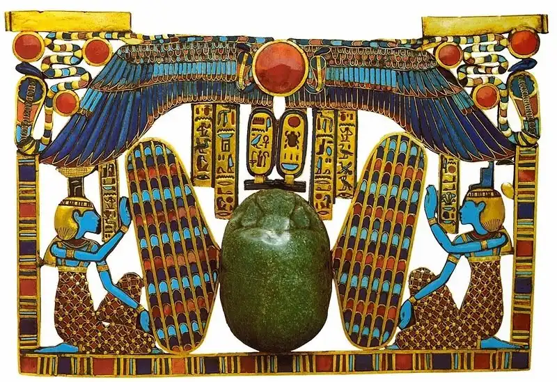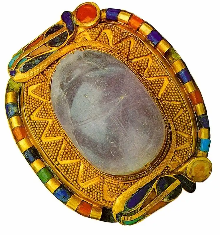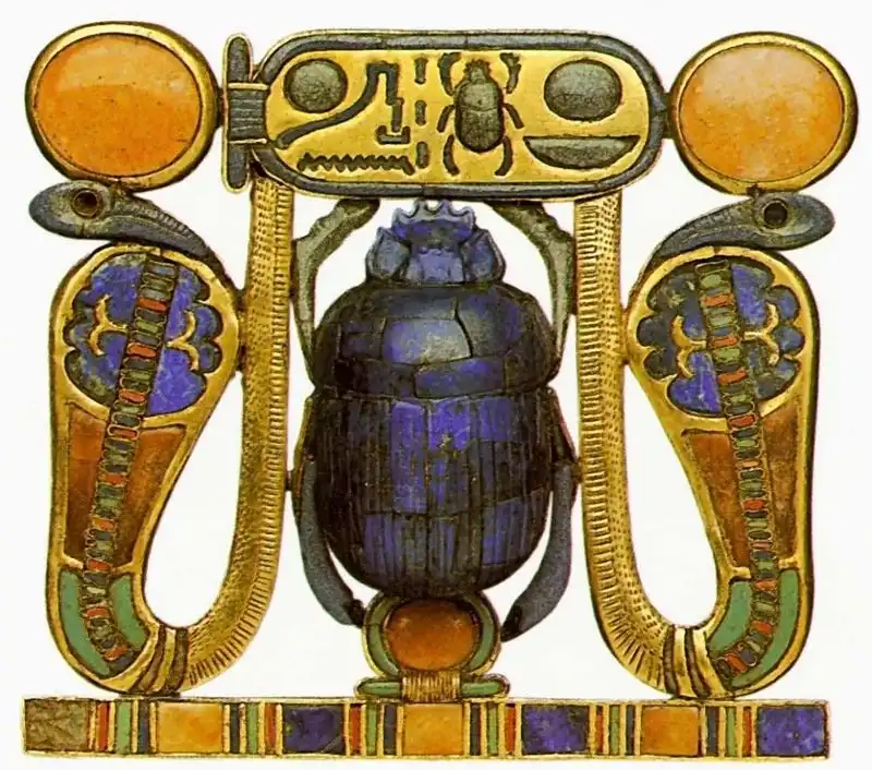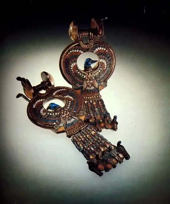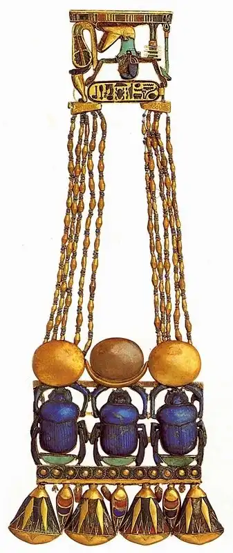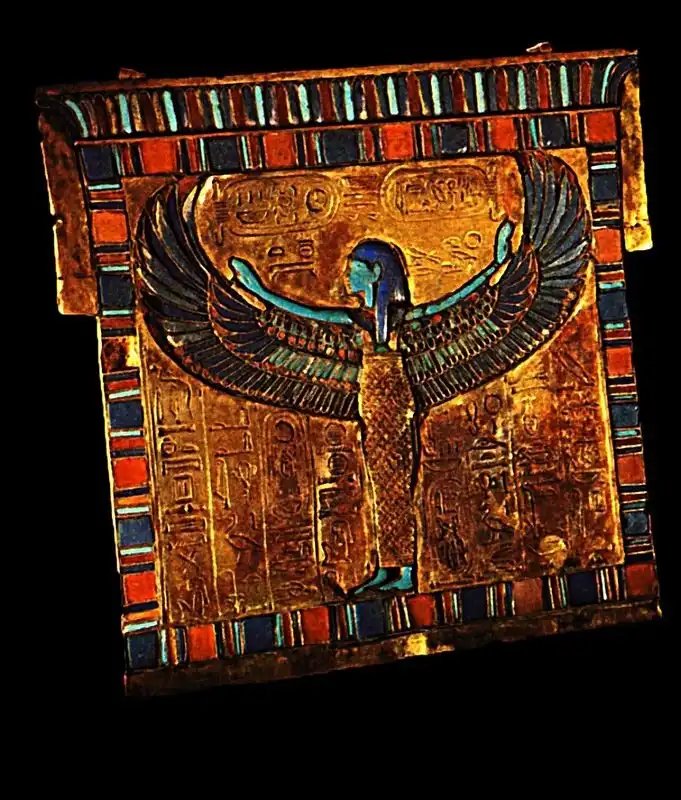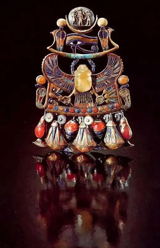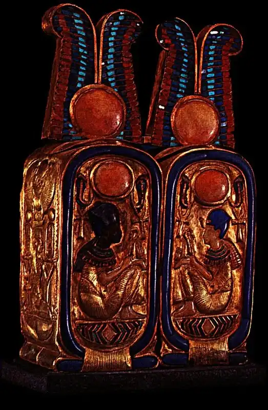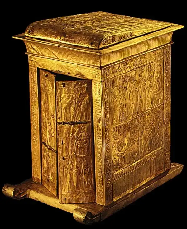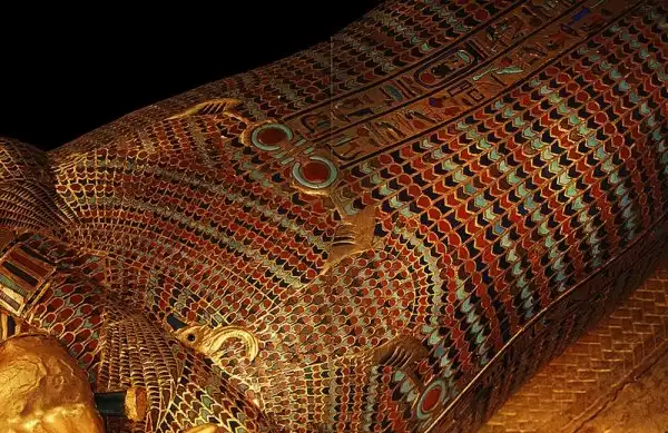 К удивлению ученых, внутри, под крышкой гроба, оказался еще один гроб, изображавший фараона богом Осирисом. Неоценима художественная ценность его, украшенного яшмой, лазуритом и бирюзовым стеклом, а также позолоченного. А подняв вторую крышку. Картер обнаружил третий гроб из толстого золотого листа, целиком копирующий фигуру мумии. Гроб был усыпан полудрагоценными камнями, на шее фигуры сверкали ожерелья и бусы разных цветов.