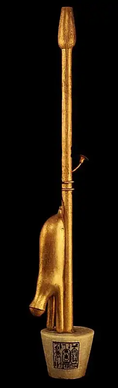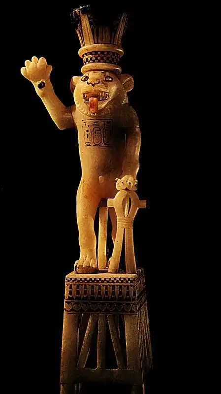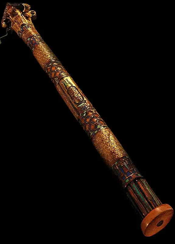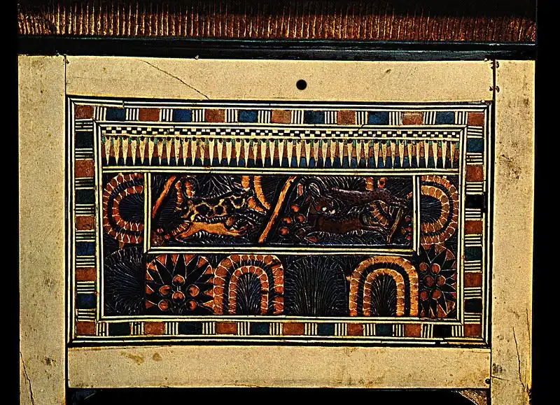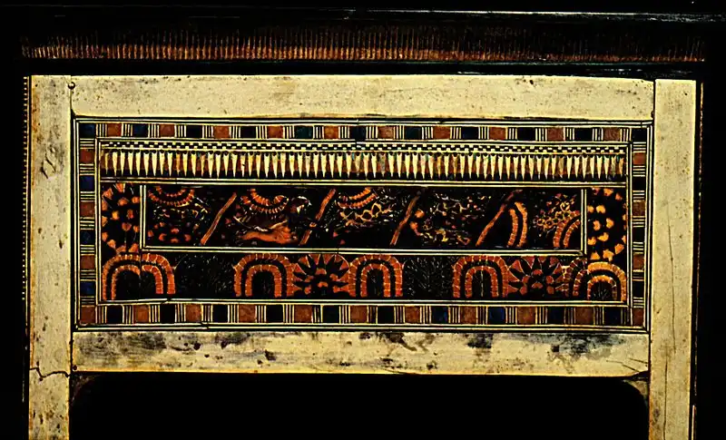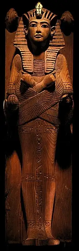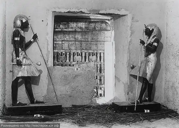 Сотни предметов находились в помещении, впоследствии названном Передней комнатой, в полнейшем беспорядке, "как ненужная мебель в чулане", по меткому выражению сэра Алана Гардинера. И только две фигуры в полный рост, симметрично взаимонаправленные, стояли по обеим сторонам замурованного и запечатанного дверного проема, что находился по правой стене. Фигуры были из дерева, пропитанного чем-то вроде асфальта, раскрашенные черными и золотыми красками, на лбу у них были царские уреи, а в руках — золотые жезлы. Каждая из фигур опиралась на длинный посох. После осмотра содержимого Передней комнаты Картер и Карнарвон поняли значение замурованного входа: