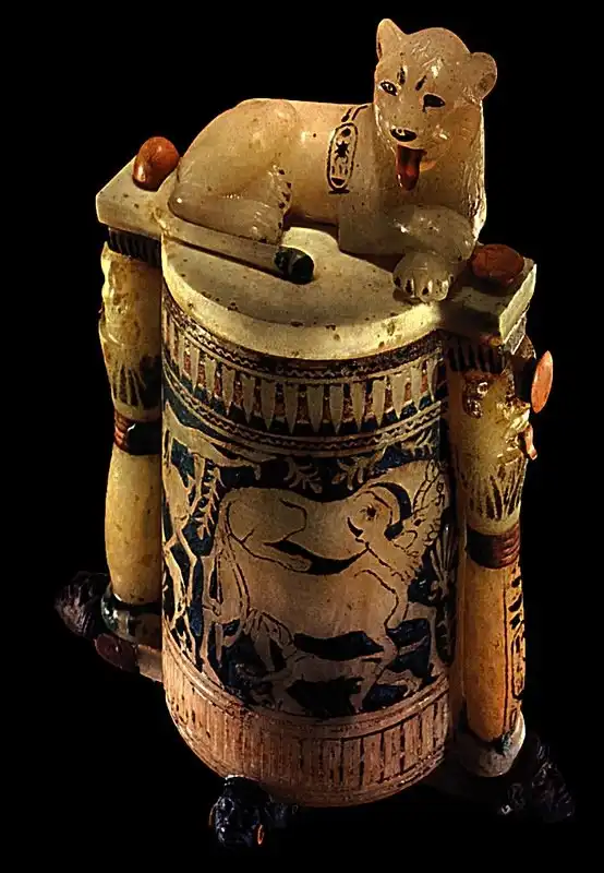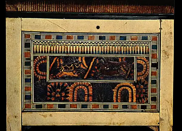 Когда были завершены все подготовительные работы, Картер стал открывать сам ковчег. Как уже говори- лось, внутри был вставлен еще один, по убранству ничуть не уступающий внешнему, а, сорвав царские печати, археолог нашел еще два ковчега, один в другом, и они были не менее прекрасны, чем первые два. Открыв и их, Картер коснулся царского саркофага. Саркофаг был сделан из желтого кварцита и стоял на алебастровом постаменте. Крышка саркофага была изготовлена из розового гранита. Камнерезы постарались: горельефы с четырех сторон изображали охраняющих саркофаг богинь, обнимающих его руками и крыльями.