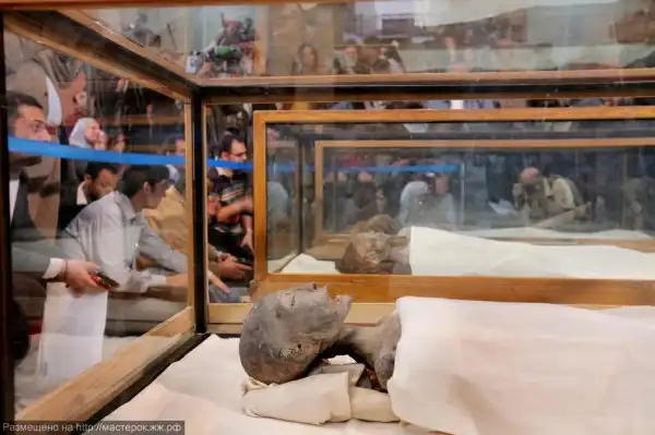 На этом снимке канала «Discovery» можно увидеть мумии (начиная с ближней) матери Тутанхамона, бабушки Тутанхамона и отца Тутанхамона, представленные репортерам на пресс-конференции археологом Захи Хавассом в музее Каира 17 февраля 2010 года. Два года анализов ДНК и томографий мумии Тутанхамона и 15 других фараонов помогло установить генеалогическое дерево королевской семьи, доказав, что отцом Тутанхамона был фараон Эхнатон, и матерью – его родная сестра. (AP Photo/Discovery Channel, Shawn Baldwin)