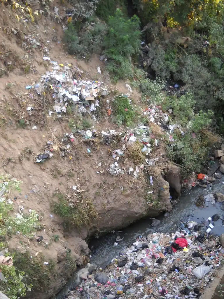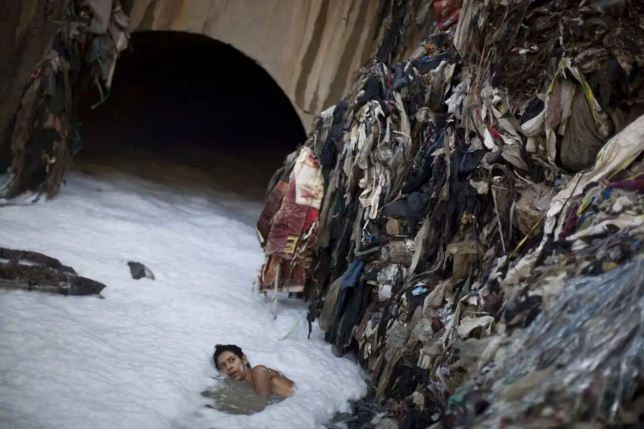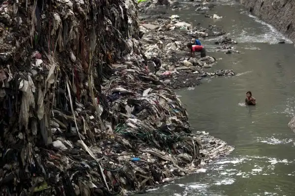 15-летняя Балукуита ищет металлолом в грязных водах рядом с горой мусора.