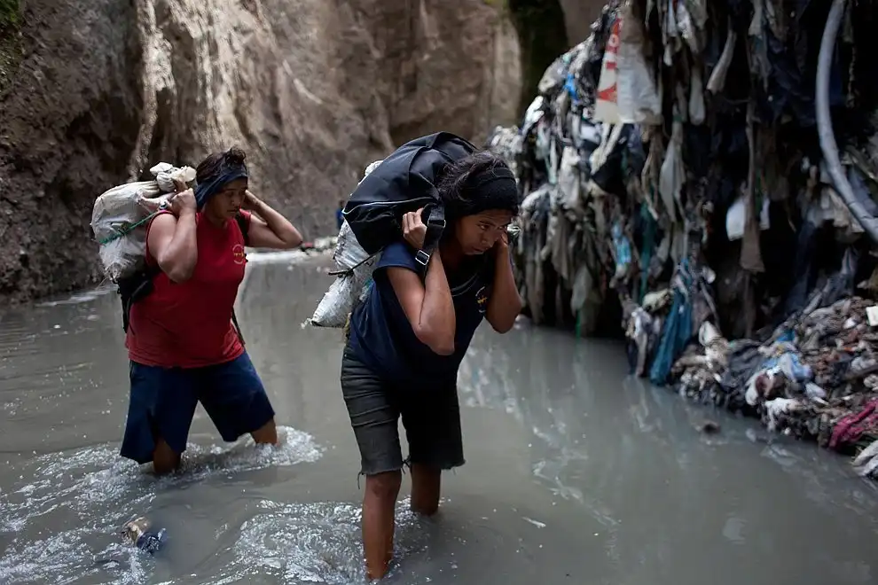 29-летняя Ирма (справа) и 30-летняя Дора выбираются со свалки с мешками, набитыми мусором. Они возвращаются после ночной «смены» на свалке.