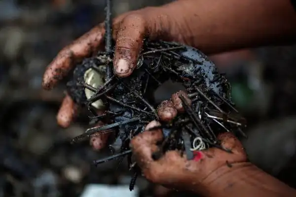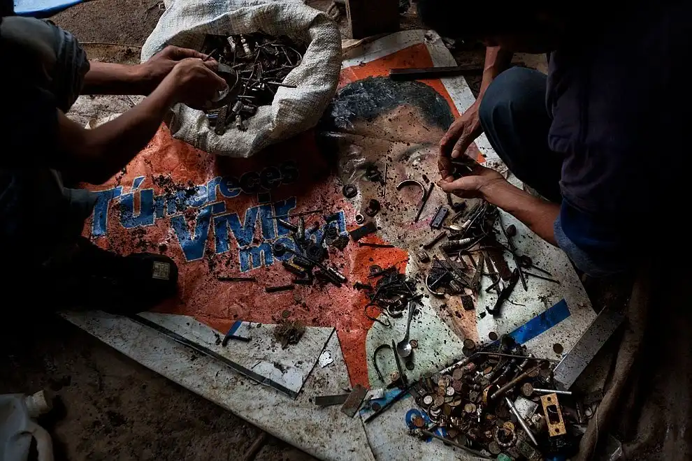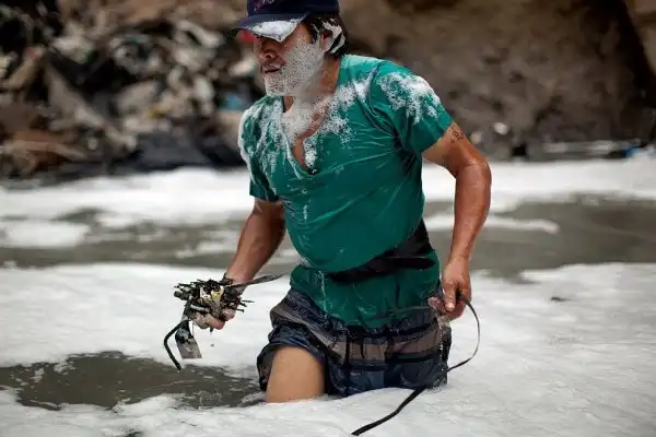 Мальчик по имени Паллета ищет металл в грязных сточных водах.