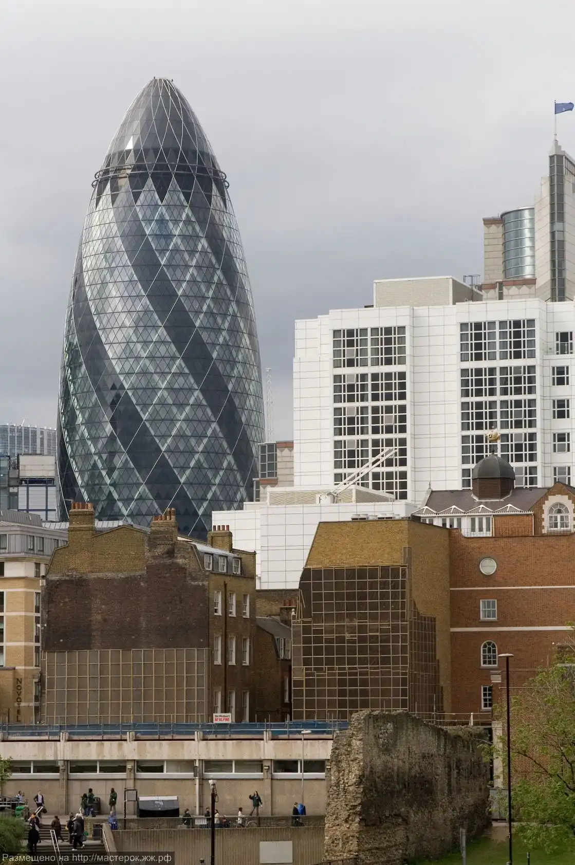 Споры вокруг небоскреба-огурца поднялись еще на этапе проектирования. Пока одни считали, что мощная сетчато-стеклянная конструкция испортит чинный облик города, другие утверждали, что Лондон давно заслужил архитектурных перемен. Победили новаторы. «Корнишон» вознесся в небо, впустив в себя тысячи офисных сотрудников и выиграв несколько архитектурных премий. Высотка стала одной из самых экологичных построек в мире: благодаря использованию солнечных батарей, она потребляет в два раза меньше энергии, чем похожие сооружения. На верхних этажах небоскреба находятся несколько ресторанов и бар.