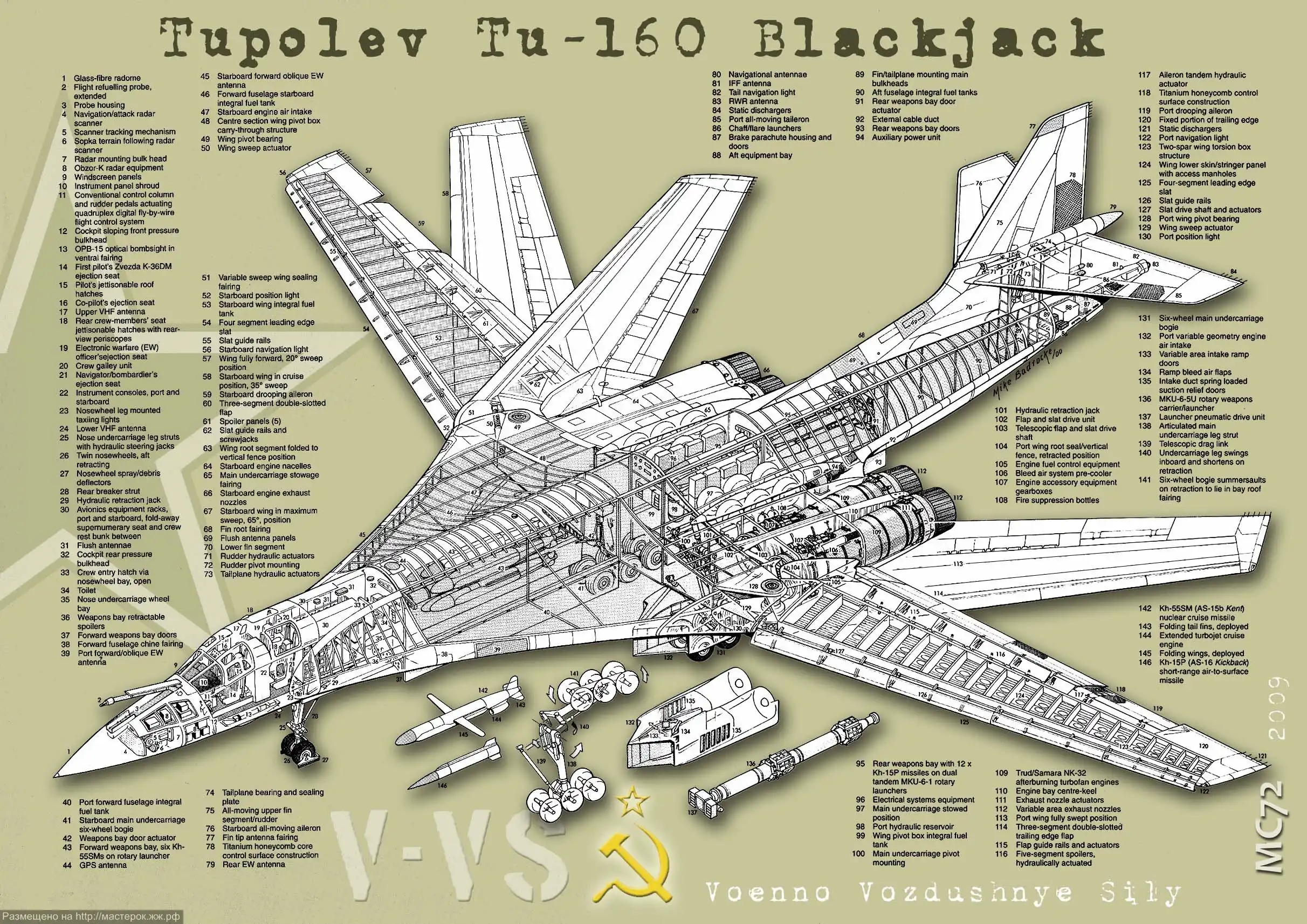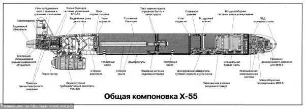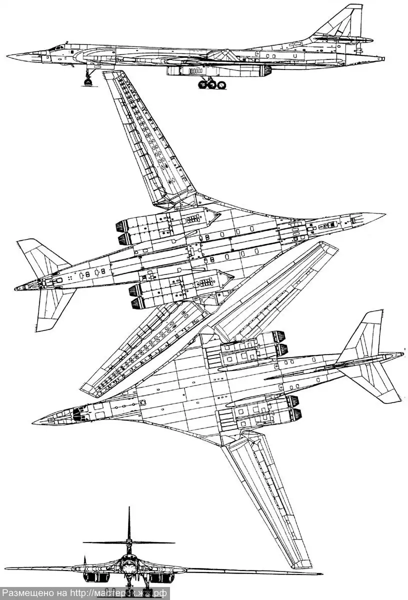Вооружение: в двух подфюзеляжных отсеках размещается различная целевая нагрузка общей массой 22 500 кг, максимальная – до 40 000 кг. В состав вооружения входят тактические и стратегические крылатые ракеты X-55 и X-55M, а также аэробаллистические гиперзвуковые УР малой дальности X-15 (M=5) с ядерными и неядерными БЧ, а также корректируемые авиационные бомбы КАБ различных типов до КАБ-1500, обычные виды бомб, а также мины.