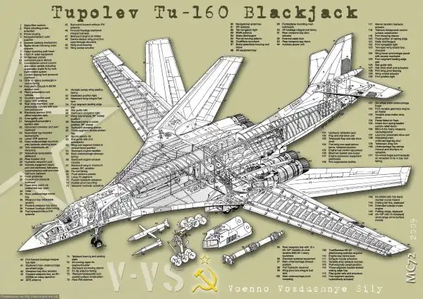 Ту-160 (по классификации НАТО Blackjack) – сверхзвуковой бомбардировщик-ракетоносец, обладающий крылом изменяемой стреловидности, создан ОКБ Туполева в 1980-х годах. Состоит на вооружении, начиная с 1987 года. В составе ВВС России в настоящее время находится 16 стратегических ракетоносцев Ту-160. Данный самолет является самым большим в истории военной авиации сверхзвуковым самолётом и самолётом с крылом изменяемой геометрии, а также самым тяжелым среди всех боевых самолетов мира. Ту-160 обладает крупнейшей среди всех существующих бомбардировщиков максимальной взлётной массой. Среди российских пилотов самолет имеет прозвище «Белый лебедь».