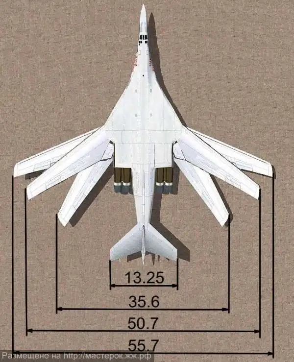 Размеры: размах крыла максимальный – 55,7 м., минимальный – 35,6 м., длина – 54,1 м., высота – 13,2 м.