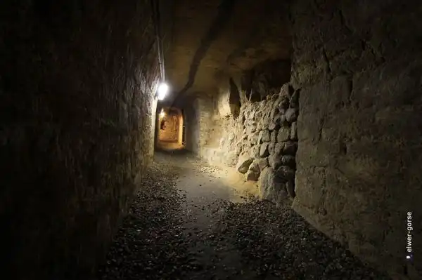 :Схема катакомб системы GRS. Изначальное зарождение выработок датировано 1260 г. В связи с частыми оползнями в 1813 г. поступил указ о запрете дальнейшего развития системы.