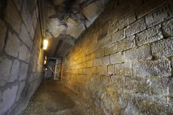 Раньше на этом месте находилась камера выработок известняка, которую во время укрепительных работ полностью засыпали и заложили камнем снаружи.