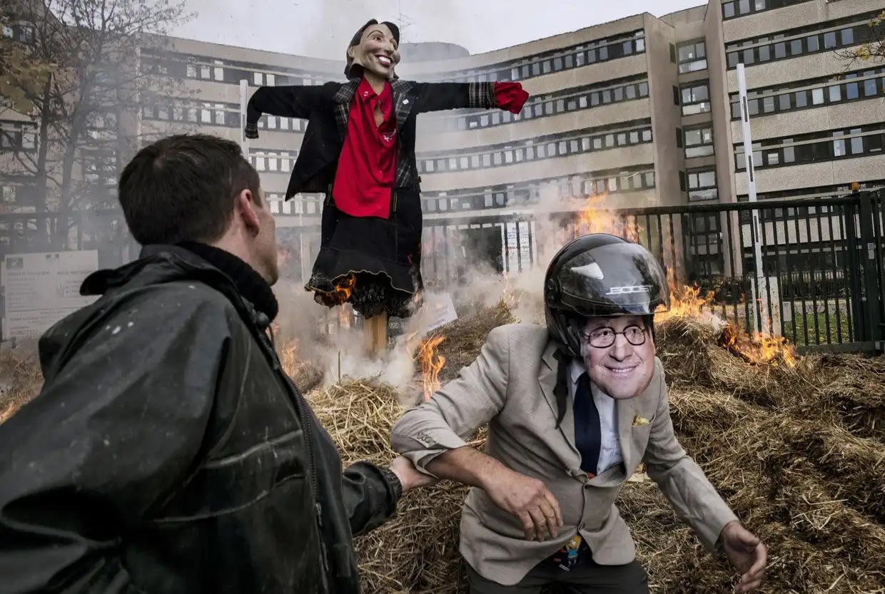 Сожжение чучела министра экологии Сеголен Руаял, город Дижон, 5 ноября 2014. Справа — убегающий человек в маске президента Франсуа Олланда.
