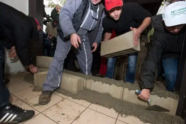 Если уж делать, так делать хорошо. Фермеры не просто решили завалить вход в здание департамента сельского хозяйства, но выложить тут кладку из блоков, Везуль, 5 ноября 2014.