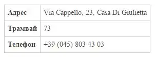 Вход во дворец «Casa di Giulietta» украшает мраморная скульптура-шляпа – герб дворянского семейства Даль Капелло. Почему шляпа? Да потому что именно так в переводе с итальянского звучит слово «капелло». Бывшее жилище нежной и романтичной представительницы рода Капулетти за минувшие века сменило десятки хозяев и даже, как утверждает история, на протяжении какого-то времени выполняло функции постоялого двора.