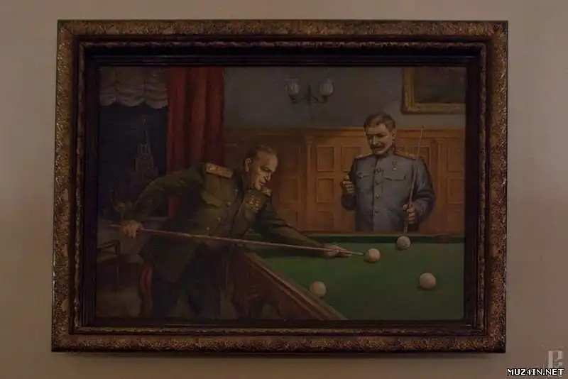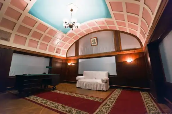 Входим в святая святых – комнату отдыха Сталина. Высокосводная – выше четырех метров, – она стилизована под кремлевский кабинет вождя: паркет, дубовые панели по стенам, массивный стол с зеленым сукном, лампа под белым колпаком, настенные бра и символ уюта и покоя – диван в белом чехле, столь напоминающем саван. Портреты двух особо почитаемых Сталиным полководцев – Суворова и Кутузова.