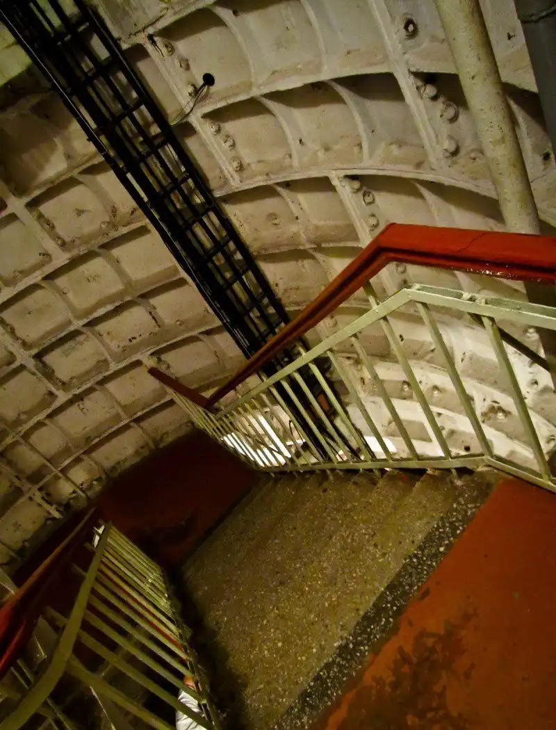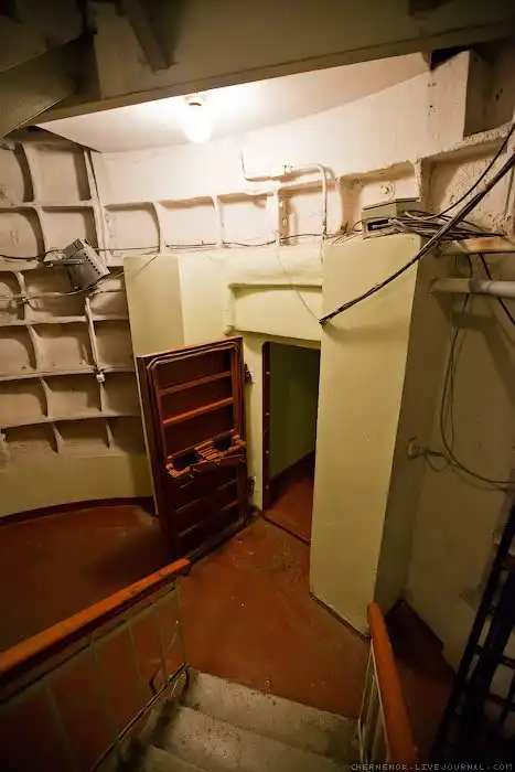 Пройдя гермодвери, мы попадаем в главную часть бункера – вертикальный ствол-убежище, уходящий в глубь земли еще на 23 метра. Он – точная копия метрополитеновского тоннеля, прорытого отвесно. Если пропустить спуск по шахтам, то и не скажешь, что находишься на глубине 8-этажного дома. Кажется, что ты просто в подъезде дома.