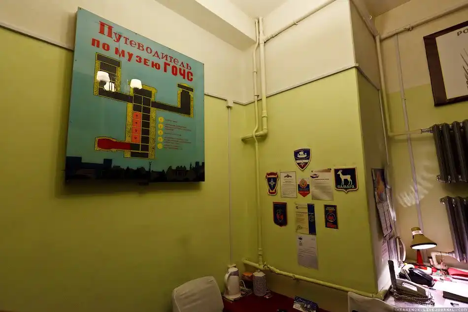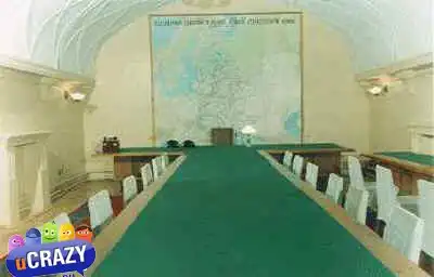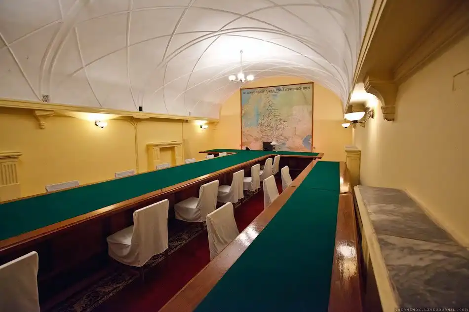 Отдельного внимания заслуживает комната правительственной связи и зал оперативной связи со штабом Красной Армии – здесь до сих пор работает кнопка тревоги и действует замечательная телефонная связь.«Куда ведет этот кабель, доподлинно не известно. Но то, что здесь была прямая связь с Москвой, – это однозначно, и демонстрирует телефонные провода, торчащие из стены в комнате правительственной связи. - Кабель прокладывали на 14-16 метров под землей – такова была инструкция.Здесь есть 68 номеров, и связь до сих пор работает.