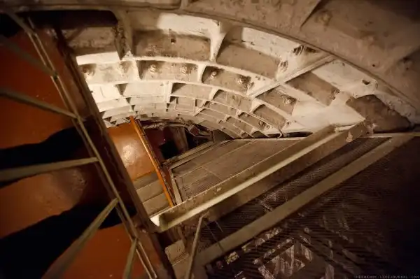 Посреди коридора, ведущего к запасному выходу, расположен вход в главную часть бункера – вертикальный ствол-убежище, уходящий в глубь земли еще на 23 метра. Он – точная копия метрополитеновского тоннеля, прорытого отвесно. Из его широкого зева, подсвеченного на лестничных площадках, веет холодом подземелья, настынувшего за полвека.
