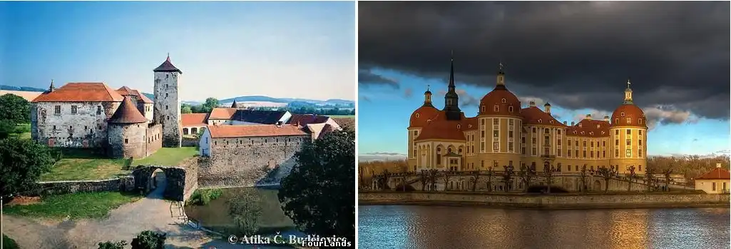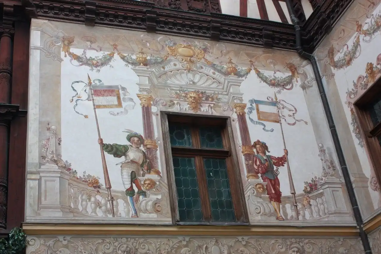 Огромное количество скульптур, шикарный парк вокруг, невероятные фрески на стенах, о резьбе по дереву, которая украшает фасад дома, внутреннее убранство, стены, мебель ходят легенды. Об этом замке можно говорить часами. Он идеально вписан превым его архитектором, Иоганном Шульцем в окружающий его пейзаж. Белоснежно-кремовое здание с отделкой из темного дерева, островерхая башенка, много узоров на окнах, на крышах, на балюстрадах. И везде фрески. Дополняют картину красивые фонари в парке, множество скульптур.