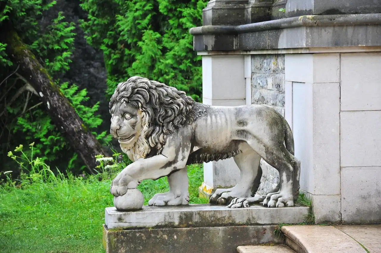 Сады и террасы украшены фонтанами, урнами, лестницами, львами, прекрасными статуями и другими декоративными деталями.
