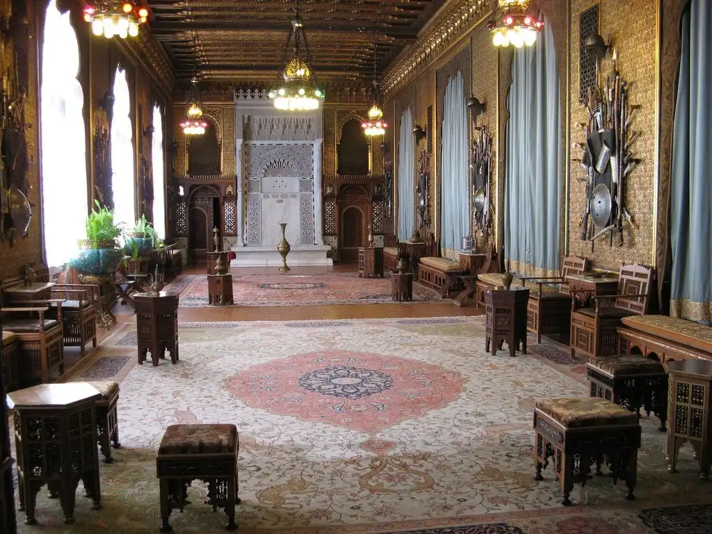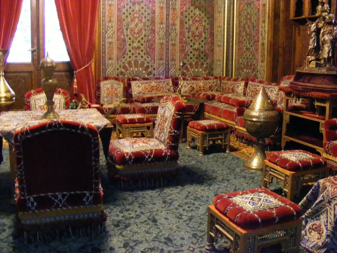 Восточный турецкий зал Пелеша — оригинальная декорация из шёлковой вышивки, специфическая турецкому стилю. На столах – кальян, сосуд для горенья благовоний. На полу — восточный ковёр из Смирны.