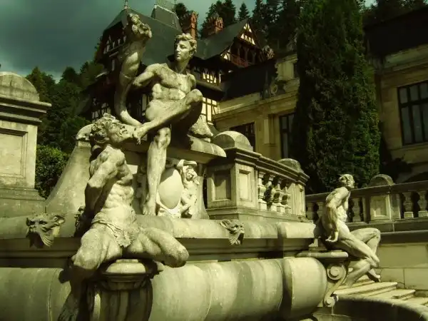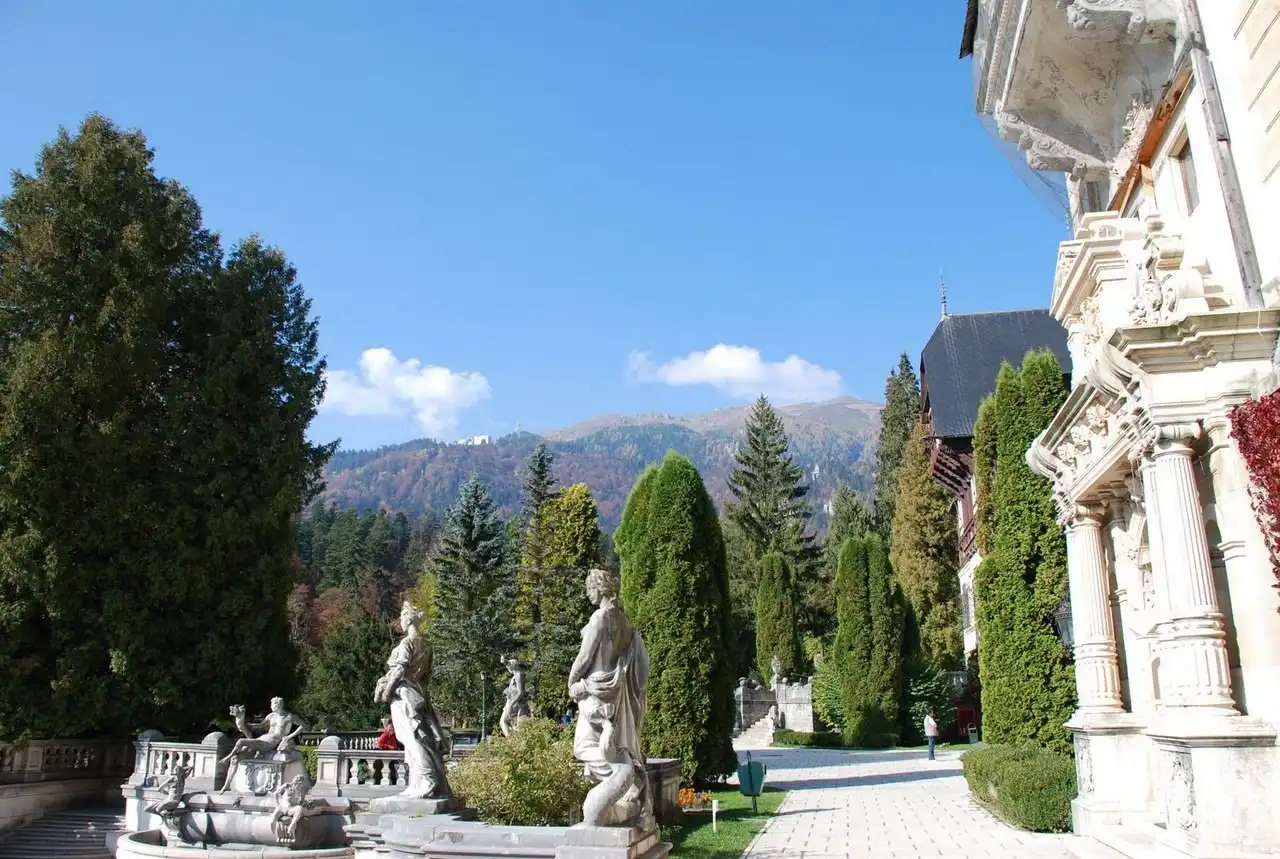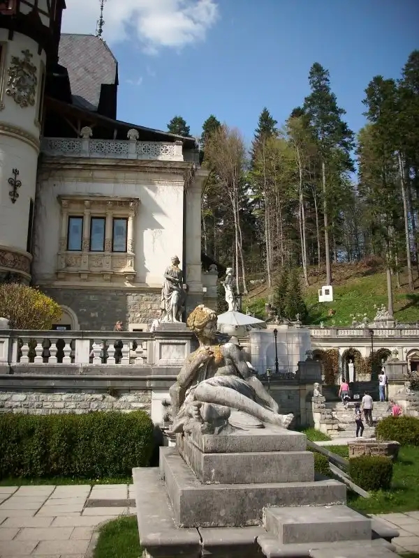 У главного входа возвышается статуя короля Кароля первого, работы итальянского скульптора Рафаелло Романелли, ему же принадлежат статуи из каррарского мрамора, расположенные на семи прелестных итальянских террасах, окружающих замок и выполненных в стиле неоренессанса. В парке находится и памятник королеве Елизавете, изображающий супругу Кароля первого за вышиванием — традиционным румынским искусством.