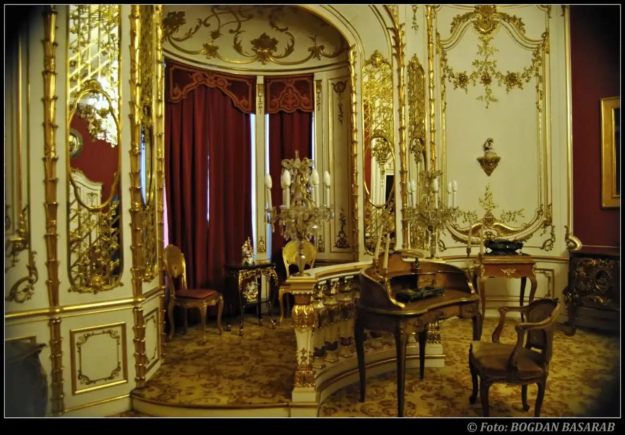 Рабочий кабинет короля во Дворце Пелеш декорирован картинами и мебелью в немецком стиле. Между витражными окнами находится пюпитр для официальных аудиенций, а рядом — стол у которого работал король.