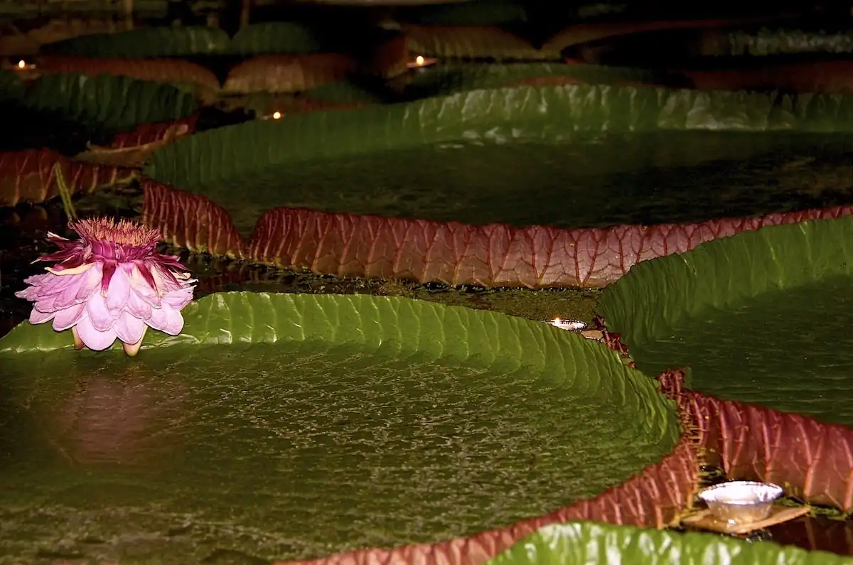 Родина этой кувшинки водоемы Амазонки. Края листьев загнуты вверх, нижняя поверхность их оснащена мощными шипами – это приспособления для защиты от водоплавающих вредителей. Свое имя «царственная», именно так переводится название Виктория-Регия, кувшинка получила благодаря цветкам. Раскрывается бутон в десять вечера, с этого момента начинается настоящий маскарад. Внутри цветка происходят процессы, в результате которых повышается температура и меняется кислотность лепестков. Из-за этого изменяется их окрас. Сначала цвет белый, а уже к концу второй ночи лепестки кувшинки темно-фиолетовые.