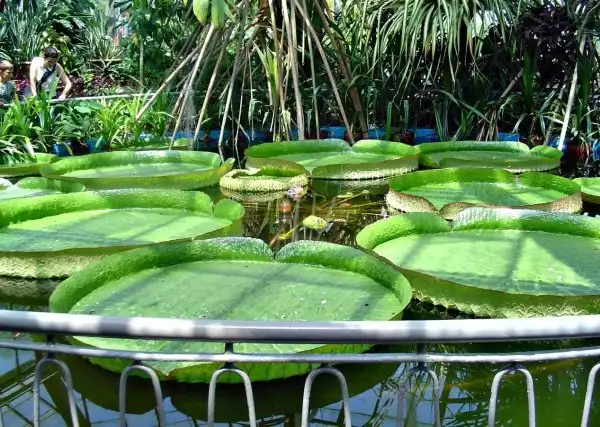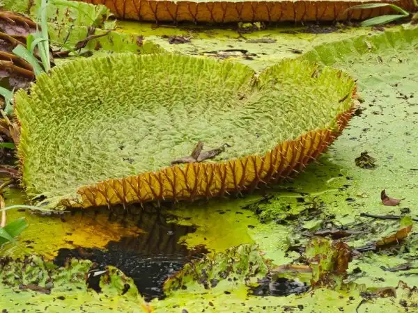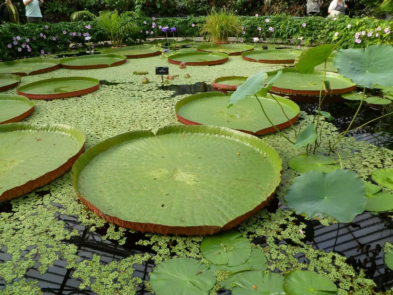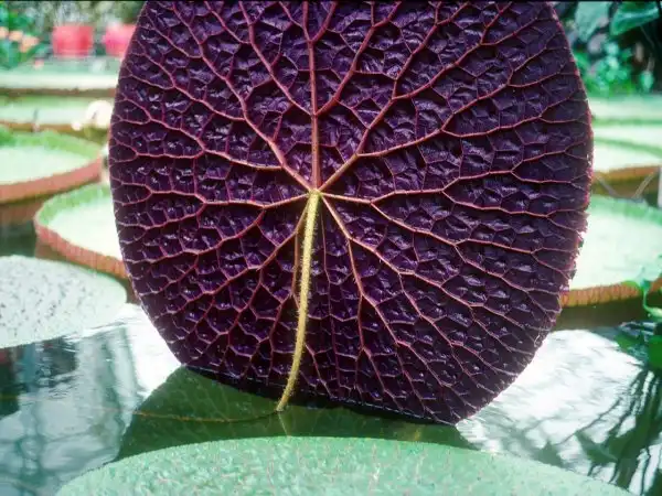 На родине, в тропиках, у виктории вырастает более двенадцати листьев. При этом новый лист появляется каждые два-три дня. Он начинает разворачиваться днем и за ночь достигает обычных размеров. Вся поверхность реки сплошь покрывается огромными двухметровыми кругами, и для других водных растений места не остается. Рядом с викторией уживается только самое крошечное цветковое растение нашей планеты - вольфия.