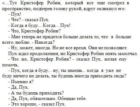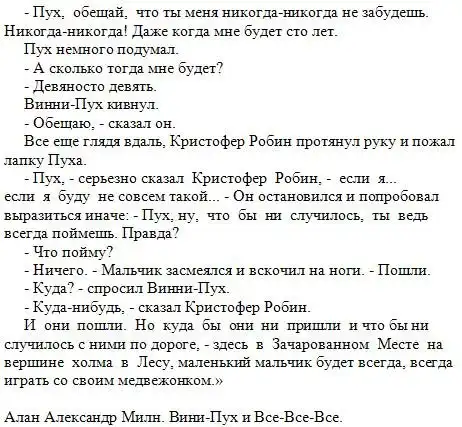 Вскоре после выхода «Винни-Пуха» А.А. Милн писал в «Нэйшн»: «Думаю, что каждый из нас втайне мечтает о бессмертии. В том смысле, что его имя переживет тело и будет жить в этом мире, несмотря на то, что сам человек перешел в мир иной». Когда Милн умер, ни у кого не было сомнений, что он открыл для себя секрет бессмертия. И это не 15 минут славы, это настоящее бессмертие, которое, вопреки его собственным ожиданиям, ему принесли не пьесы и новеллы, а маленький медвежонок с опилками в голове.