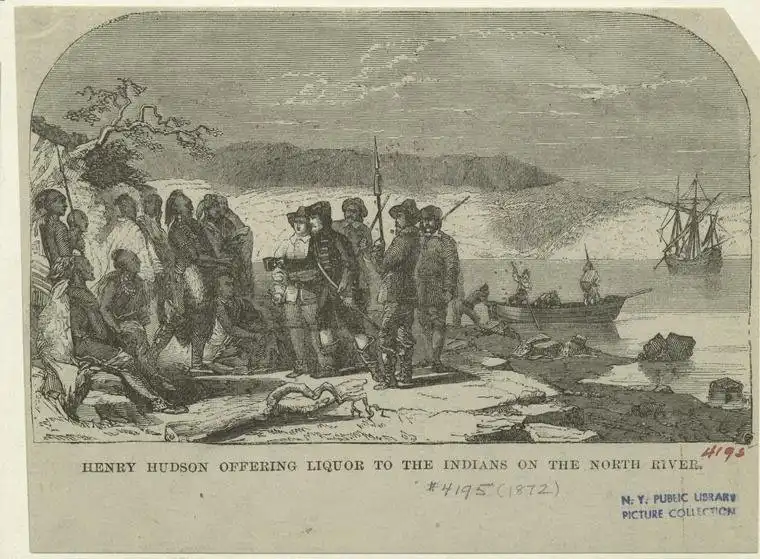 Генри Гудзон предлагает индейцам попробовать алкоголь.
