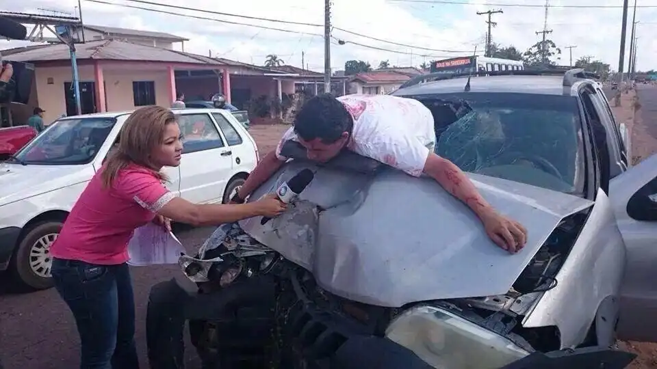 Бразильский корреспондент берет интервью у участника аварии: "Добрый день! Вкратце, расскажите об аварии!"