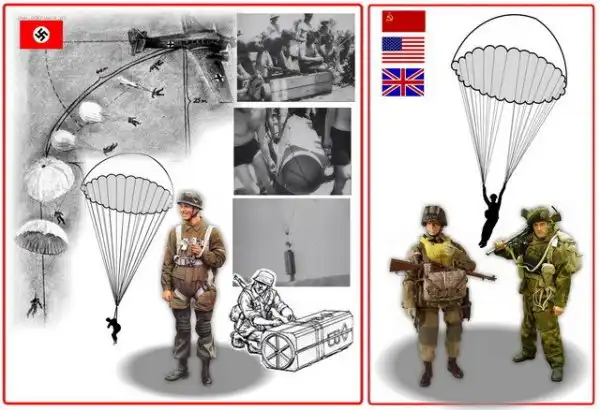 В отличие от Германии парашютные системы воющих против нее стран были лишены этих недостатков. Десантирование производилось с полной выкладкой.