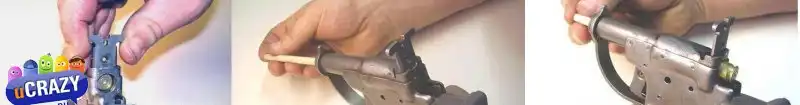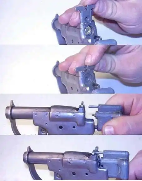 В результате ударник вставал на боевой взвод, а боек располагался точно напротив отверстия в центре пластины-затвора и напротив капсюля патрона. После нажатия на спусковой крючок происходит выстрел.
