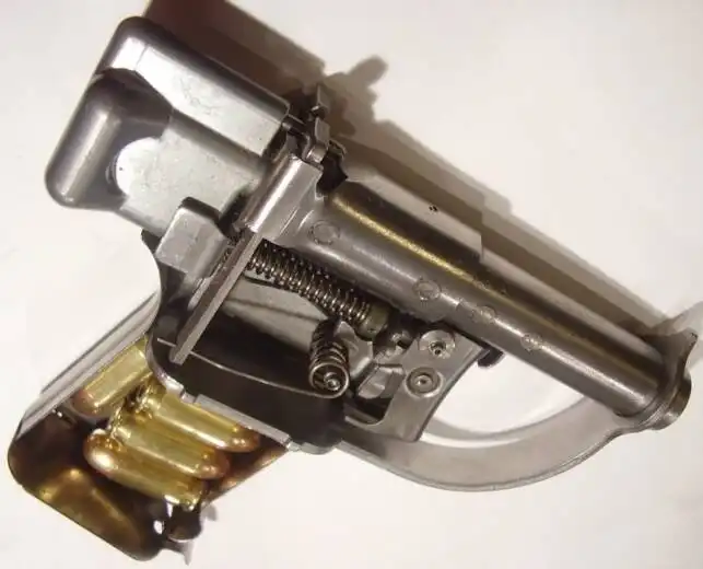 Рукоятка пистолета в нижней части имеет сдвижную крышку под которой в полости размещают 10 запасных патронов (8 горизонтально и 2 вертикально).