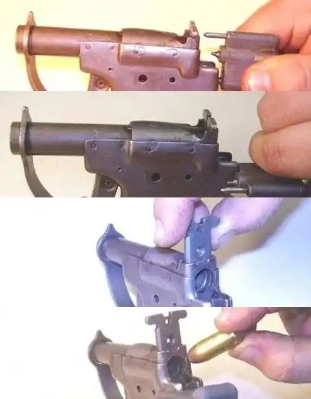 Для снаряжения пистолета необходимо было извлечь из рукоятки патрон, предварительно сдвинув крышку в нижней части рукоятки. Ударник оттягивали назад и поворачивали влево на 90 градусов. Пластину-затвор по пазам казенника перемещали вверх и вставляли в патронник ствола патрон. Затем запирали ствол, опуская пластину-затвор в нижнее положение, а ударник поворачивали на 90 градусов в исходное положение.