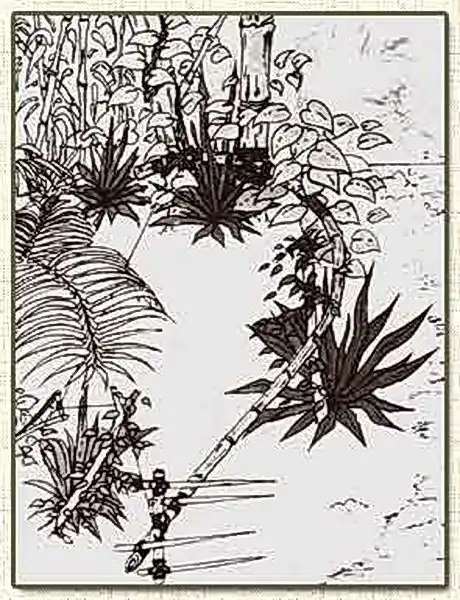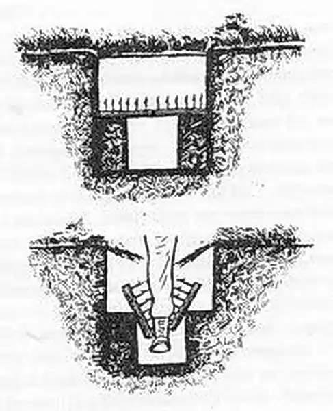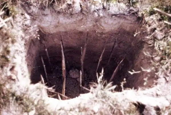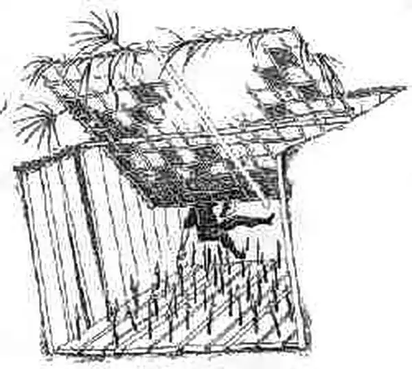 Две доски с кольями скреплялись эластичной резиной, растягивались, между ними вставлялись тонкие бамбуковые палочки. Стоило провалиться в такую ловушку, сломав палочки, как створки захлопывались как раз на уровне живота жертвы. На дне ямы также могли быть вкопаны дополнительные колья.