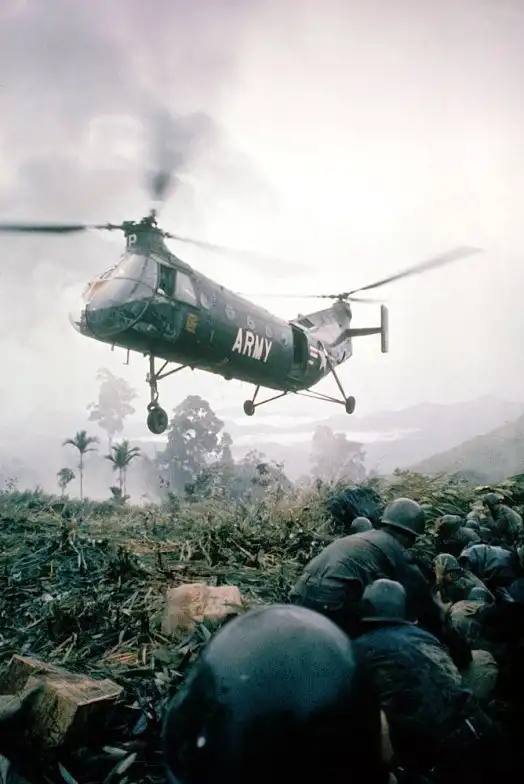 Вертолет Piasecki H-21 «Shawnee» перебрасывает подкрепление и забирает раненых. Вьетнам. Начало войны. 1965 г.