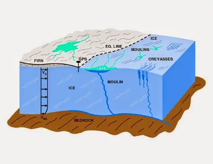 Эта схема наглядно иллюстрирует, как мулены перемещают воду с поверхности к основанию ледника:
